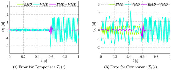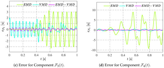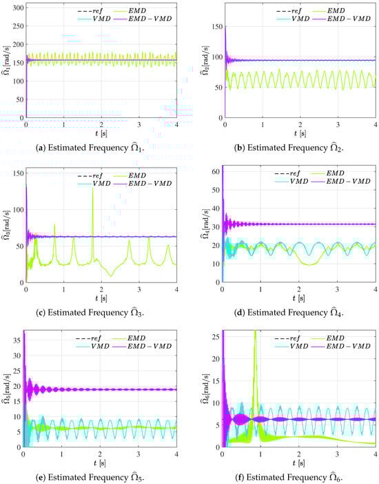 The instantaneous frequencies estimated by each method are shown in Figure 23. The hybrid method accurately tracks the time-varying nature of the frequencies, highlighting its robustness in handling nonstationary components. Unlike EMD, which struggles to resolve overlapping frequencies, and VMD, which requires predefined parameters that limit its adaptability, the hybrid method dynamically adapts to the frequency variations present in the signal. This capability is particularly evident in components with smooth transitions, such as , where the hybrid approach demonstrates superior accuracy in reconstructing the instantaneous frequency trajectory.