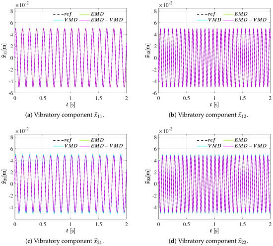 Supported by studies addressing cases of complex nonlinear systems [,,,,], the hybrid EMD–VMD approach is presented as a practical option with satisfactory results for advanced signal analysis. By integrating the adaptive capabilities of EMD with the spectral precision of VMD, this methodology effectively addresses challenges associated with signals exhibiting nonlinear and nonstationary characteristics, such as time-varying frequencies and amplitudes, quadratic trends, and Gaussian noise [,].