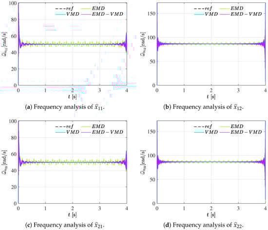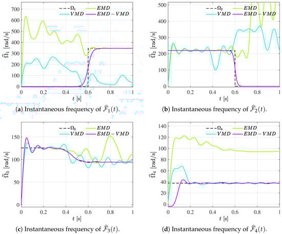 Instantaneous frequencies estimated for each IMF using EMD, VMD, and the hybrid EMD–VMD method: (a) , (b) , (c) , (d) .