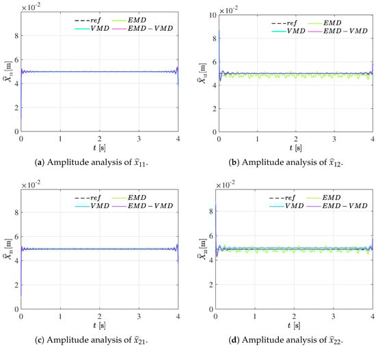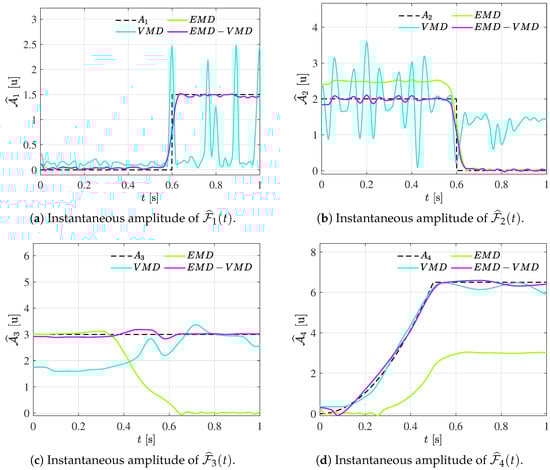 The instantaneous amplitudes for each component are presented in Figure 24. The hybrid method provides accurate amplitude tracking, further validating its effectiveness. Notably, for components like , where the amplitude varies significantly due to modulation, the hybrid method captures these variations with precision, surpassing the limitations of both EMD and VMD in scenarios involving rapid amplitude fluctuations. This accuracy underscores the method’s ability to reconstruct the original signal components faithfully, even under challenging conditions such as additive Gaussian noise and nonstationarity.