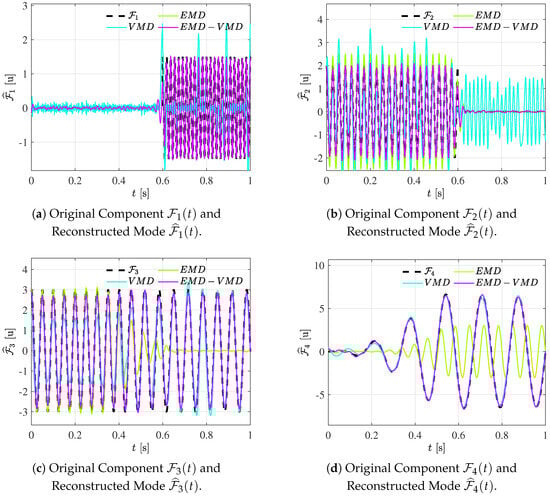 In addition to improving accuracy and efficiency in the decomposition of complex signals, the hybrid method demonstrates remarkable flexibility in interdisciplinary applications. Fields such as biomedical signal processing, vibration analysis, and structural monitoring benefit from this strategy, not only in terms of robustness against noise but also in its ability to identify and separate frequency components in dynamic and noisy scenarios [,,]. As a result, this approach stands out as a good option with satisfactory results for complex real-world applications.