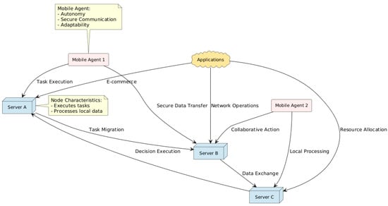 Mobile agents can be deployed across various domains including network operations, distributed computing, e-commerce, and resource allocation. These autonomous software entities possess the capability to navigate distributed environments independently, executing complex tasks while optimizing system efficiency. Their distributed nature enables efficient load balancing, reduced network traffic, and enhanced system flexibility through asynchronous execution and local processing capabilities [,,]. Figure 2 shows the versatility of mobile agents in a distributed system, showcasing their generic functionality in various contexts like task execution, secure communication, and collaboration across nodes.