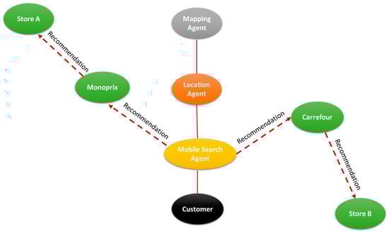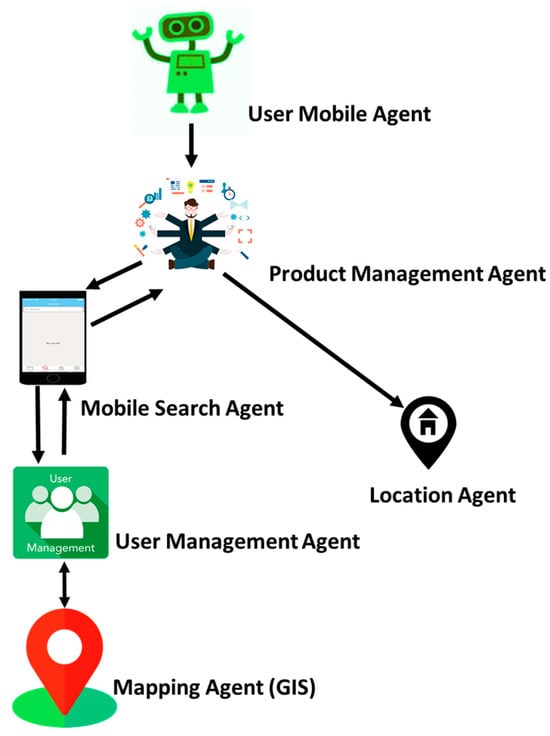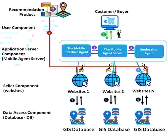 The interrelationship among different agents and vendors in a mobile agent and GIS-based recommendation system are described in the integrated system diagram, as shown in Figure 14. The figure offers information on how elements, included agents and vendors, cooperate and assist customers with customized suggestions.