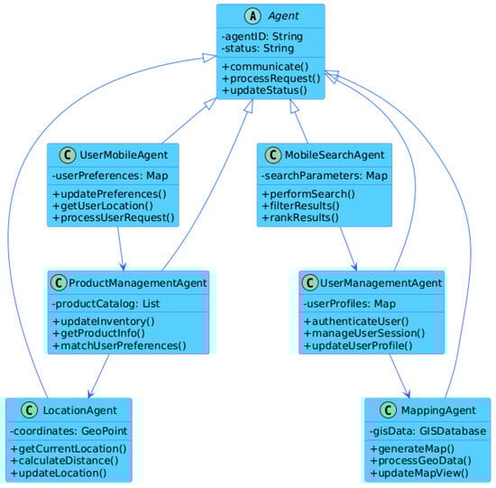 The system implements an advanced communication framework between multiple specialized agents to deliver personalized, location-aware recommendations. Figure 3 illustrates the multi-agent interaction model, in which each agent performs specific functions while maintaining synchronized communication with other system components, while Figure 4 provides a detailed structural view of the agent framework through a UML class diagram.