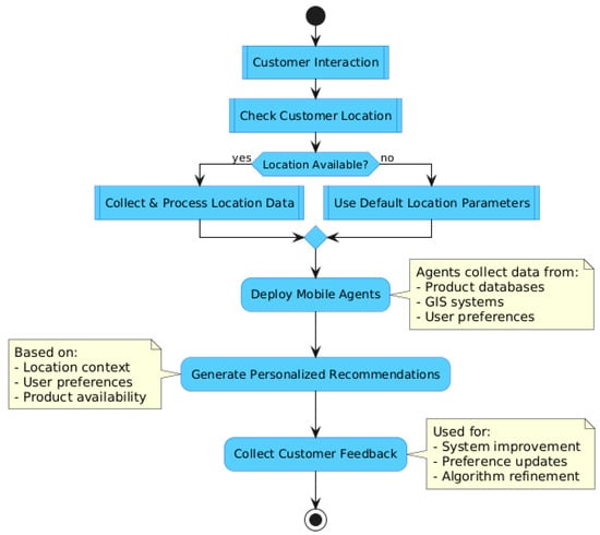 The system implements a structured workflow that coordinates the interaction between customers, mobile agents, and GIS components to deliver personalized recommendations. Figure 6 illustrates the systematic process flow from the initial customer interaction to final feedback collection.
