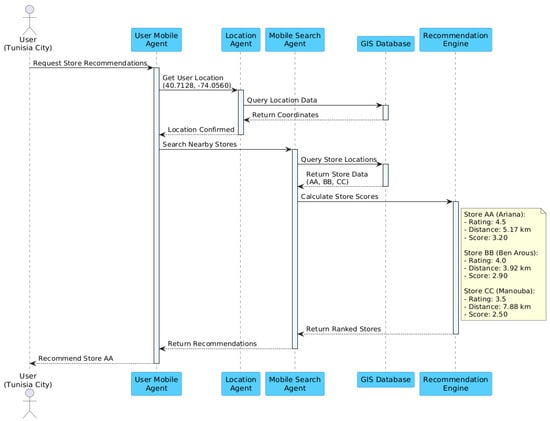 Our approach introduces significant technical innovations in e-commerce recommendation systems. The mobile agent framework enables immediate responses to changing user contexts, addressing a key limitation of traditional static recommendation systems. The integration of GISs provides deeper insights into user behavior patterns within physical retail spaces, while the sophisticated interaction between specialized agents enables more refined recommendation strategies. In their exploration of the application of GISs for spatial-temporal pattern analysis [], the authors showed how GIS technologies might reveal hidden tendencies in consumer behavior. Furthermore, the resilience of the JADE framework for dynamic data processing has been demonstrated by other experiments, such as that conducted by [], which confirmed its capacity to support mobile agent communication.
