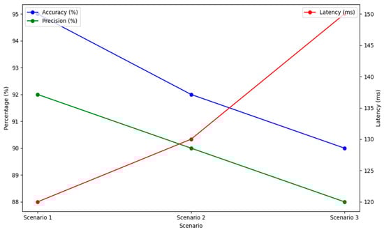 Figure 8 illustrates how well the recommendation system performed in three different scenarios: two using static user locations in Nabeul and Tunisia City, and one using dynamic user mobility. It shows the latency (ms) (red, secondary axis), accuracy (%) (blue), and precision (%) (green). While Scenario 3 exhibits a higher latency as a result of real-time processing, Scenario 1 attains the maximum accuracy and precision. The system’s capacity to deliver precise, timely, and pertinent recommendations under a range of user circumstances is depicted in the figure.