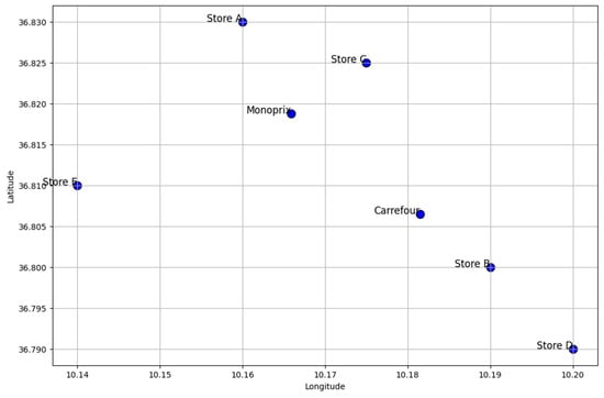 A two-dimensional spread map demonstrating the positions of Carrefour, Monoprix, Shop A, Shop B, and other retail shops is shown in Figure 15. The latitude and longitude of these stores are displayed graphically in this figure, which sheds light on their geographical distribution.