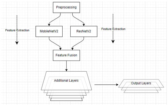 In the process of synthesizing the required architecture, transfer learning was performed, which incorporated MobileNetV2 and ResNet50V2 models as feature extractors. Transfer learning is the idea of using features learned in one task to another different but related task, which helps the model to obtain benefits of pre-learned representations, and thus, the training from scratch is not always necessary. Figure 1 illustrates the development process for the proposed architecture from the preprocessing phase up to inferencing, as shown in Figure 1 below.