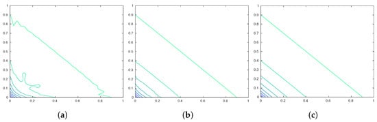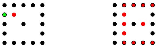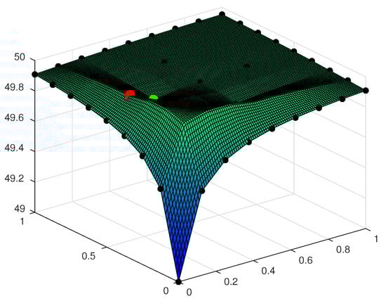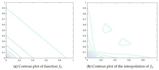 . Let be data points with . A function f is called monotone if it holds that or . In case of strict inequalities f is strictly monotone. The interpolation of f is monotone, if for every pair of two points it holdsorwith strict inequality for strictly monotone interpolation. Note that we are interested in higher dimensions and aim for one-dimensional monotone interpolation for the restriction to the different dimensions.