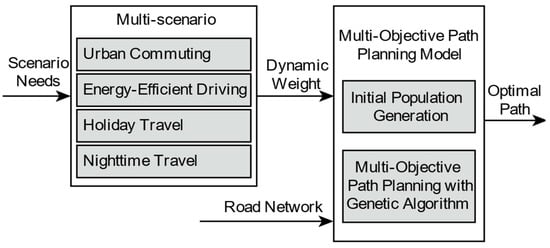 Single-objective optimization algorithms are limited in their ability to balance multiple conflicting objectives, making them less practical for path planning that requires comprehensive consideration of multiple factors. Multi-objective optimization provides a more comprehensive and flexible path-planning solution suited to diverse application scenarios and user requirements. However, optimizing multiple objectives simultaneously in path planning significantly increases the problem’s complexity. Current research lacks in-depth consideration of user-specific requirements for different driving scenarios within urban traffic systems [,,].