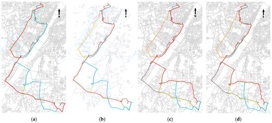 Multi-Scenario Path-Planning Results: (a) Urban Commuting Scenario; (b) Energy-Efficient Driving Scenario; (c) Holiday Travel Scenario; (d) Nighttime Travel Scenario.