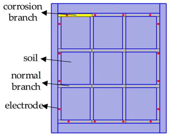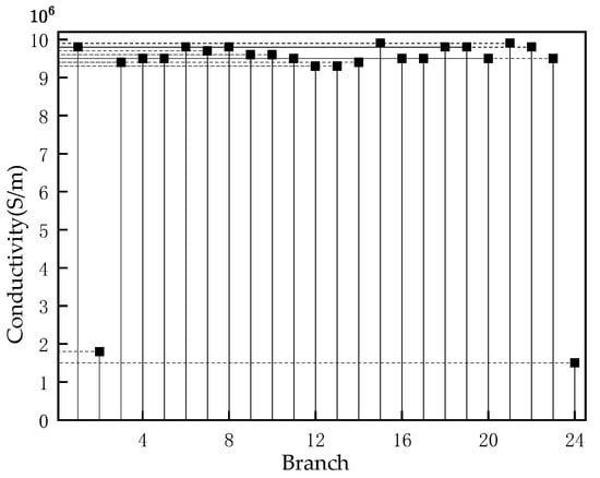 The conductivity value of each branch can be calculated by Equation (18), and then the corrosion situation can be further obtained. According to the corrosion situation after imaging of model 3 in Figure 13, it can be concluded that branch 2 and branch 24 are severely corroded. The conductivity of branch 2 is calculated to be , and its corrosion degree is 82%. The conductivity of branch 24 is , and its corrosion degree is 85%.