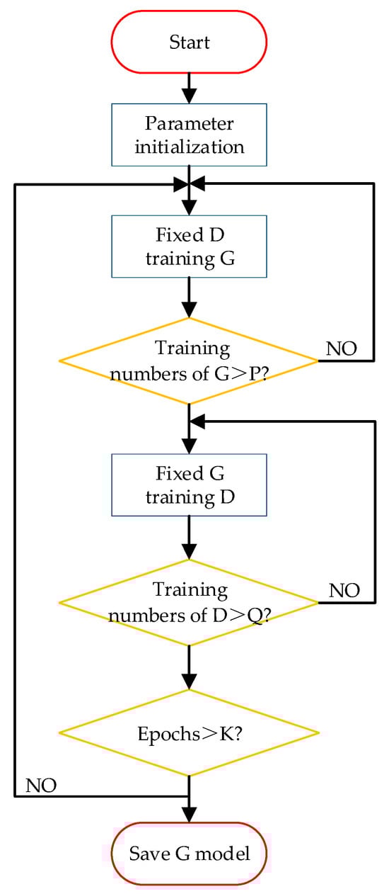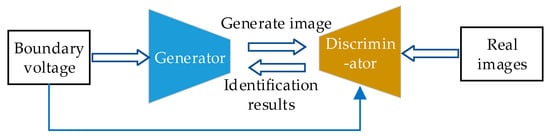 The entire training process is shown in Figure 8. During the training process, the training data and test data are first normalized, and then the structural parameters of the generative network and the discriminative network are set, including loss function parameters, activation function parameters, batch size parameters, number of iterations, etc., and initialized. The Adam optimizer is used for network training. The training process is mainly divided into two stages. First, the parameters of the discriminator D are fixed, and the EIT image data generated by G and the true conductivity distribution are combined with the conditional information, respectively, and input into the discriminator D to optimize the parameters of G and improve the image generation ability of the generative network; then, the parameters of the generator G are fixed, and the parameters of D are updated according to the output of G to enhance the ability of the discriminative network to identify true and false samples. The two are optimized alternately to continuously improve the overall performance.
