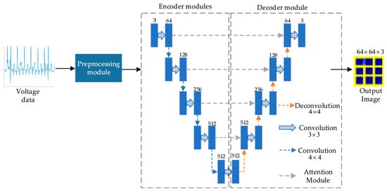 The generator of this method is mainly composed of four modules: the preprocessing module, encoder module, decoder module and attention module. Its structure is shown in Figure 5. First, the input layer receives the boundary voltage value, and the preliminary feature map of the ground grid electrical impedance imaging is obtained after passing through the preprocessing module. Then, the high-level features are extracted for imaging through a U-shaped structure network with a depth of 5 layers. The encoder module of U-Net consists of multiple down-sampling layers, each of which contains two convolutional layers with a convolution kernel size of . The stride of the first convolutional layer is 1, which is used for fine feature extraction; the stride of the second convolutional layer is 2, which replaces the traditional pooling layer to better preserve the detail information in image reconstruction. In order to speed up network training and prevent overfitting, batch normalization, a dropout layer and a leaky-ReLU activation function are introduced in the encoder. Its batch normalization is as shown in Equation (4):