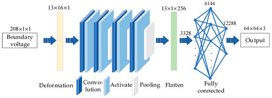 The preprocessing module is responsible for learning the nonlinear mapping relationship between the boundary voltage and the target impedance image to form a preliminary grounding grid impedance image. As shown in Figure 6, the input layer accepts 208 boundary voltage values, and the boundary voltage data sequence is converted into a matrix through the fully connected layer and the deformation layer for further two-dimensional feature extraction. Its expression is given in Equation (5).
