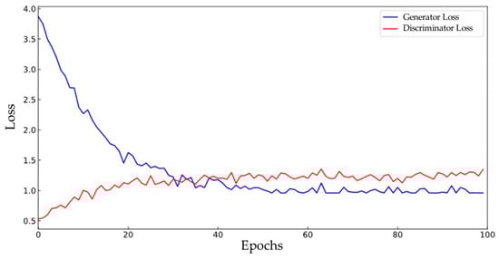After the dataset was constructed, 100 rounds of training were conducted. Figure 9 shows the loss curves of the generator and discriminator during the training process. The generator loss is composed of adversarial loss and L1 regularization, while the discriminator loss reflects the performance when distinguishing between real samples and generated samples. The curve shows stable convergence at around 50 rounds of training, indicating that the training is balanced and feature learning is effective, without problems such as mode collapse or over-strengthening of the discriminator.