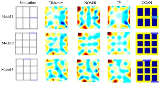 In order to verify the effectiveness of the algorithm, this paper carried out experimental verification on a large number of test sets of grounding grid boundary voltages, analyzed the potential maps of different corrosion locations and corrosion degrees, and compared the conductivity topology maps obtained by the Tikhonov algorithm, NORSE algorithm, TV algorithm and CGAN imaging algorithm. A representative corrosion model was selected for simulation imaging, and the conductivity of the corrosion site was . The imaging effect is shown in Figure 10. According to the definition of conductivity value of image color mapping above, red, yellow and blue in turn represent the decrease of conductivity. The bluer represents lower conductivity, which is usually corrosive location or land. It is not difficult to find that the traditional EIT algorithm struggles to accurately determine the corrosion location due to its morbidity and underdetermination when solving nonlinear inverse problems. The branch edge of the conductivity topology map presented in its imaging is poor, and there are artifacts in the branch. The actual conductivity difference between the corrosion site and the soil cannot be distinguished. It can only roughly reflect the corrosion location, and it is even more difficult to determine the degree of corrosion. Although the imaging of the improved CGAN algorithm proposed in this paper has conductivity color errors and a small amount of noise, it can accurately determine the corrosion location.