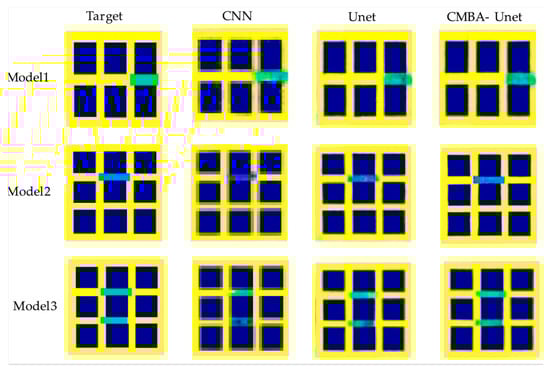 In order to verify the improvement effect of the improved CGAN algorithm, experimental comparisons were made with the generative network using CNN and U-net. Here, 100 rounds of training were conducted under the same conditions. The test set used typical single corrosion and double corrosion models. The imaging effect is shown in Figure 11. The green part of model 1 and 3 represents grounding grid corrosion, and the conductivity of the actual corrosion part is and . Model 2 is corroded at the blue position, and the conductivity at the actual corrosion position is . It can be seen that the improved CGAN imaging algorithm has made great progress in the diagnosis of grounding grid corrosion. Due to the simple structure of the CNN generator model, the image details of the generated image at the corrosion site are not clear enough, the color space information is not captured and there are artifacts at the corrosion site. The generation network composed of U-Net better retains the spatial information and local features, and the generated image quality is better than the traditional CNN. After adding the CBAM attention mechanism, the network can more adaptively select important channel features, improve the generator’s ability to capture the global structure and details of the image and reduce artifacts and distortion.