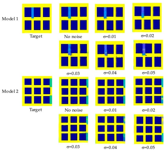 After adding Gaussian noise of different sizes, grounding grid impedance imaging is performed. As shown in Figure 12, the blue part of model 1 represents grounding grid corrosion, and the conductivity of the actual corrosion part is . Model 2 is corroded at the green position, and the conductivity at the actual corrosion position is .As the noise level increases, particularly when the standard deviation of the noise exceeds 5% of the voltage values, the imaging quality is significantly affected. However, when introducing low to moderate noise, the imaging results remain largely unaffected. Even with moderate levels of noise, the algorithm is still able to accurately detect the corrosion location and corrosion state, demonstrating the robustness and noise resilience of the proposed method. This indicates that the model can maintain a reliable performance under practical, noisy conditions, making it suitable for real-world applications where measurement noise is inevitable.