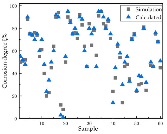 To further verify the grounding grid corrosion detection performance of this algorithm on different model test sets, the following figure shows a randomly selected part of the test data. The scatter plot of the measured corrosion degree at the corroded location and the actual corrosion degree at the corroded location are shown in Figure 14. It can be concluded that the corrosion degree of the corroded branch of the grounding grid detected by it is basically consistent with the actual one, and the error is small. This verifies that the proposed algorithm is highly accurate in assessing the degree of corrosion and shows that it can reliably detect corrosion in grounding grid systems with small errors, confirming its robustness and practical applicability in real-world scenarios.