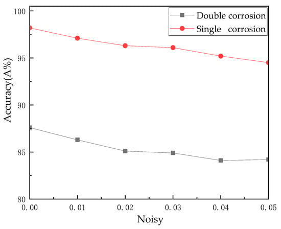 This algorithm performs ground grid imaging after adding different Gaussian noises, as shown in Figure 15. Although noise is added to the data, the noise has little effect on the imaging quality, and the accuracy of the model only slightly decreases. This shows that even in the presence of noise, the detection method can still identify the corrosion area well, indicating that the model is noise robust to a certain extent, and the decrease in accuracy is small, indicating that the interference of noise in the imaging results does not significantly affect the final detection performance.