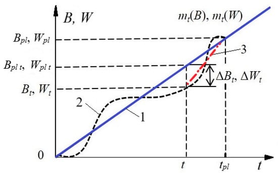 Schedule of the production plan for the output B with power consumption W for a single technological process: 1—planned schedule; 2—potential option for production output; 3—alternative option for production output in one of the stages.