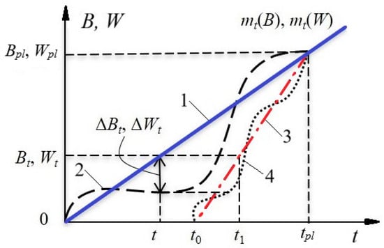 Schedule of the output plan B and electricity consumption W with a delay caused by the repair of an electrical equipment unit: 1—planned; 2—possible option for the output production; 3—option for the output production at speed ; 4—alternative option for the output production at speed .