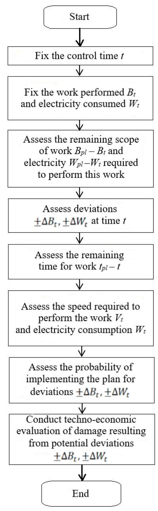 An algorithm was designed to analyze the current state of the technological process and the power consumption behavior. It takes into account the specific features of the process and assesses all intermediate and resulting indicators, including technical and economic damage. The algorithm block diagram is shown in Figure 4.