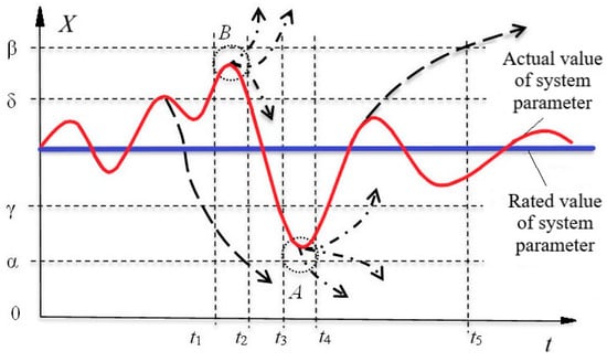 Then, the probability of compensation for the deviation over the period of time is determined by the probability of transition of the production process to speed , which is a random variable. If the distribution law and its parameters are known, the probability of compensating for the deviation in the output and electricity consumption from the power grid can be determined as the probability that the actual speed of fulfilling the output plan with electricity consumption in the remaining time will take the value . This value can be calculated by Equation (9):