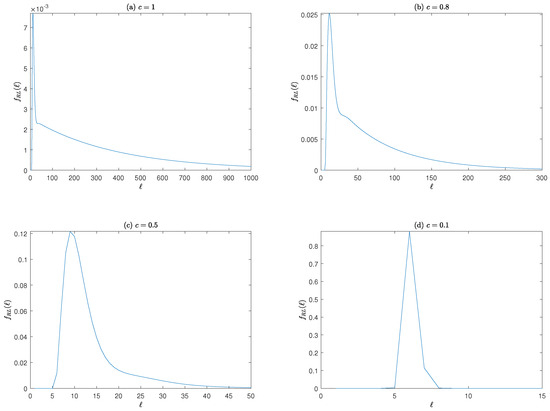 The RL of the one-sided exponential AEWMA scheme is distributed skewly. Figure 1 shows the p.d.f. curves for the RL distribution of the lower-sided exponential AEWMA scheme, where meets the in-control ARL () of 370, and the process mean shift . From Figure 1, it is evident that the RL distributions of the lower-sided exponential AEWMA scheme are significantly skewed under both in-control and out-of-control conditions.