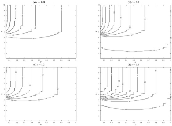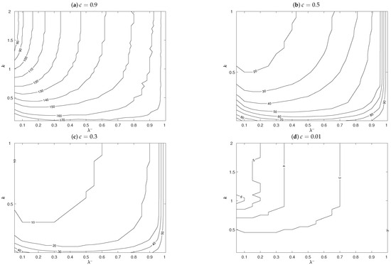 When and , Figure 3 provides the contour plot of values for the upper-sided exponential AEWMA scheme. Similarly, near the optimal parameter value of the upper-sided exponential AEWMA scheme, the value of the scheme is also smaller, and the value generally increases as k decreases.