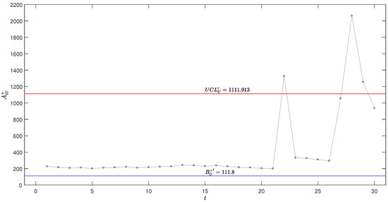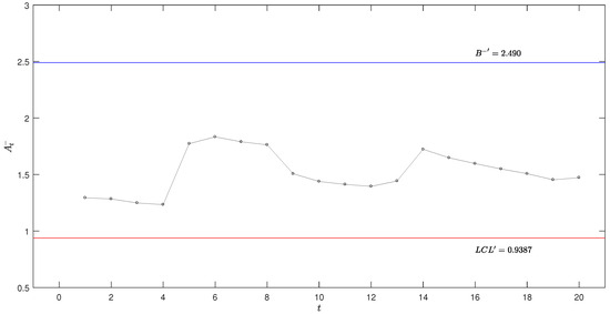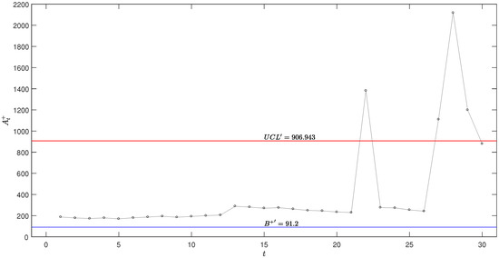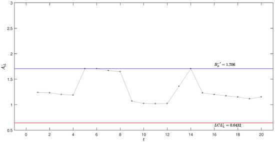 The optimal upper-sided AEWMA scheme statistic is calculated using Equation (7) (refer to Table 8 for details). To refine the monitoring scheme and account for the uncertainty in the estimation of the process mean, we consider the upper-bound of the bootstrap confidence interval, , to recalculate the adjusted parameters , , and . These adjusted parameters provide a more conservative estimate of the control limits, ensuring the monitoring scheme’s effectiveness even under conditions where the true process mean might be higher than initially estimated. The recalculated parameters are as follows: