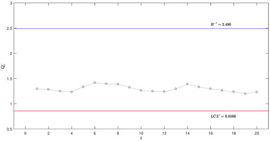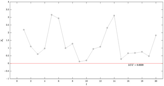 To achieve a robust estimation of the process mean, the initial 10 data points were used to compute the maximum likelihood estimate (MLE) of the process mean . Subsequently, the bootstrap method [39,40] was utilized to generate multiple resamples from these 10 data points. For each resample, the MLE of was calculated, thereby constructing a distribution of estimates. Based on this distribution, the confidence interval for was determined as . This approach allowed for a more accurate and reliable estimation of the process mean while accounting for the variability inherent in the data.