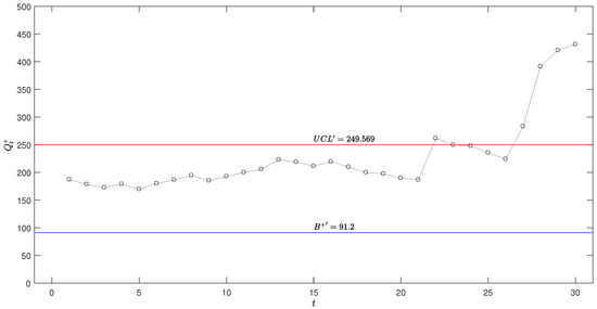 As shown in the table, at , reaches a value of , and reaches a value of , both exceeding their respective control limit and , as highlighted in bold. Additionally, it is noteworthy that at , the AEWMA statistic exceeds its control limit , signaling a potential out-of-control condition. In contrast, the adjusted AEWMA statistic remains below its respective control limit at this time point. This discrepancy highlights the sensitivity of the AEWMA scheme to upward shifts in the process mean, while the adjusted scheme, which incorporates the upper bound of the bootstrap confidence interval, provides a more conservative estimate. This observation underscores the importance of considering parameter uncertainty in the design of monitoring schemes to ensure robust performance under varying conditions.