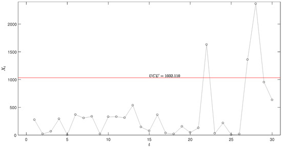 The dataset introduced by Jarrett includes the time intervals between coal mine explosions occurring from 15 March 1851, to 22 March 1962, measured in days [38]. Assuming an exponential distribution with unknown parameters, the bootstrap method was used to estimate the process mean using the first 160 data points (see Table 7). The remaining 30 data points (see Table 8) were reserved for testing purposes. To obtain a robust estimate of the process mean, the initial 160 data points were employed to compute the MLE, yielding . Subsequently, the bootstrap method generated multiple resamples from these data points. For each resample, the MLE of was recalculated, thereby forming a distribution of estimates. Based on this distribution, the confidence interval for was determined as .