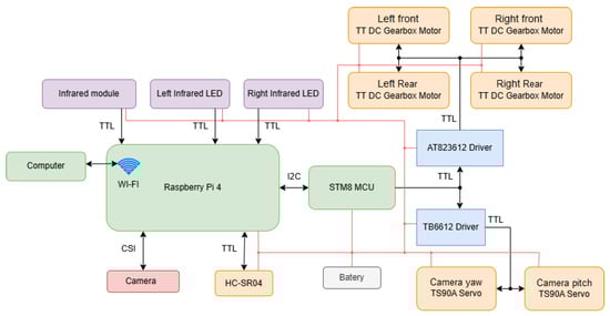 The Raspbot is equipped with interconnected components, including sensors, microcontrollers, drivers, and motors. This setup enables the robot to perform several tasks necessary for the realization of this project. Figure 1 presents a block diagram of the system’s architecture, highlighting the main components of the system and their connections [].