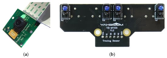 (a) Raspberry Pi Camera Rev 1.3 [] and (b) Yahboom’s 4-channel infrared tracking sensor [].