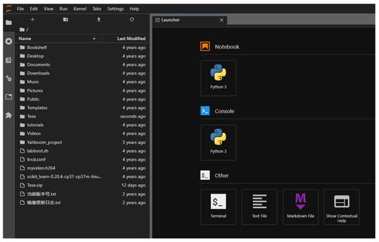 For this work, an operating system (OS) distributed by the robot’s manufacturer (based on Raspbian 5.10.63-v7l+) was used, which enables the user to connect the Raspberry Pi to a Wi-Fi network without having to connect it to a monitor or keyboard afterwards. Once connected, remote access to the system is also available through a JupyterLab 6.1.4 server (Figure 3).