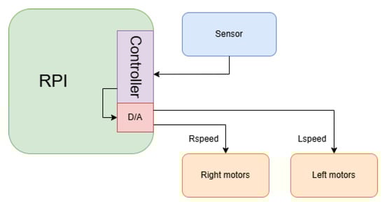 The objective of this work was to develop, implement and test multiple control methods to assess their performance in the control of a line-following robot. For that purpose, classical and deep learning methods were studied. During execution, sensor data from the infrared sensors or camera are sent to the Raspberry Pi and then the controller implemented in the software will calculate the new motor speed values and send these new values to the motors, as illustrated in Figure 4. The control is created with two values, where a single value will be updated for both right motors (front and rear), and the other value will be updated for the left motors.