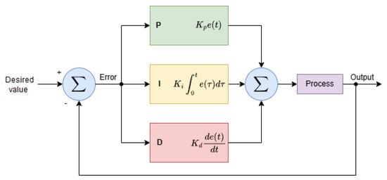 For the classical methods, the PID (Proportional–Integral–Derivative) controller was selected. The PID is the most common controller in industry and is widely used in all control applications. It also represents an essential element of more sophisticated controllers [,,,]. Figure 5 presents a block diagram of a PID-controlled system [,].