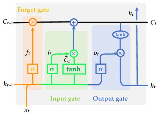 LSTM (Long-Short Term Memory) is an advanced type of RNN (recurrent neural network) developed by Hochreiter and Schmidhuber []. Traditional RNNs are characterized by using the previous output as one of the inputs of the network, similarly to PID controllers. However, RNNs have difficulty learning long-term dependencies due to the vanishing gradient problem. LSTM solves this problem by introducing a memory cell that can retain information over extended periods of time. Figure 6 shows the structure of an LSTM cell [].