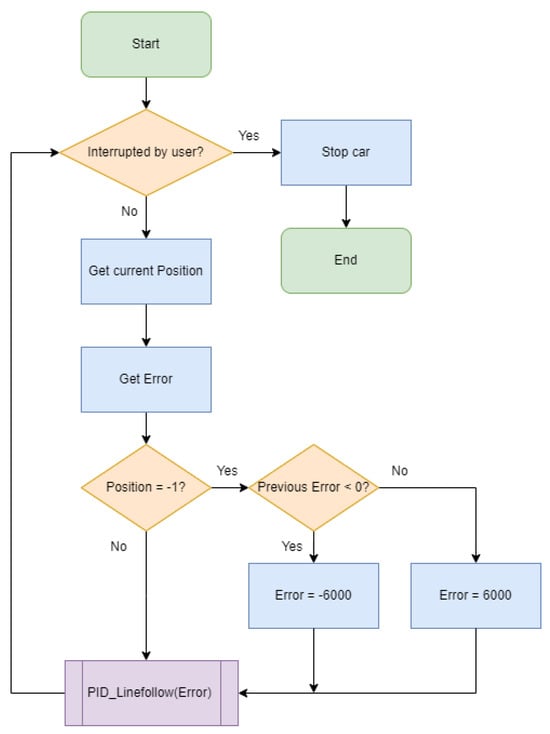 Finally, with the distance calculated, the error can be determined by subtracting the desired value (3150) from the current position, . In this way, if the error is 0, the sensor is centered with the line; if it is negative, the line is to its right; and, if it is positive, to its left. Furthermore, if the previous function returns , that is, the sensor ‘loses’ the line, the error will be adjusted taking into account the previous error. If the previous error is negative, it will be changed to , and, if positive, it will be set to 6000, as described in the implementation of Figure 7.