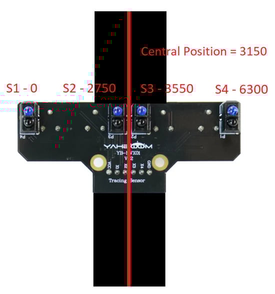 where S1 to S4 represent the binary logic values of each sensor. This estimate is completed using a weighted average of the sensor indexes multiplied by a specified value. The values used can be chosen arbitrarily, so the controller gains would need to be adjusted accordingly. However, since the four sensors are not spaced equally apart, the solution found was to match the gains to the distance between the different sensors. By measuring this distance, the values were set to 0, 2750, 3550 and 6300, with the first weight being 0, kept in the equation for clarity of the weight used for each infrared sensor of the module, as shown in Figure 8.
