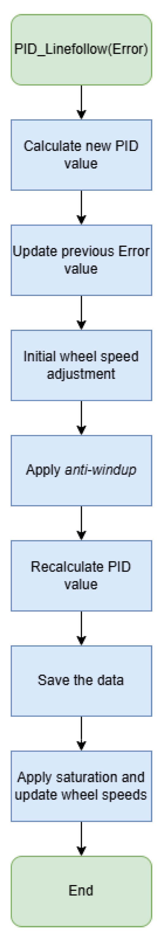With the error determined, this value can be used as the parameter for the function PID_Linefollow. Figure 9 illustrates the steps of this function: