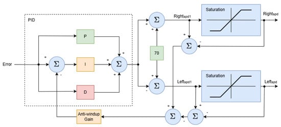 - Apply the anti-windup mechanism to ensure that the integrative action does not reach very high values, which could lead to the robot, when it loses the line, spinning indefinitely, unable to get back on track. In this way, if the wheel speeds exceed the acceptable limit (less than or more than ), the amount by which these speeds exceed the limits will be added to the anti-windup value.