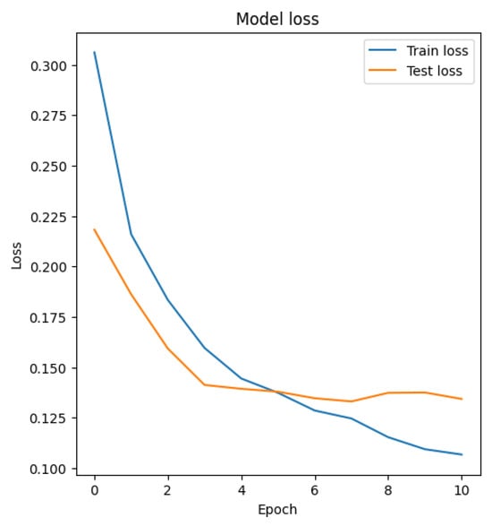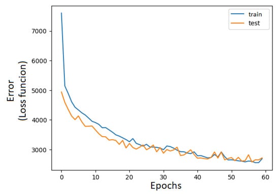 The network was trained along 60 epochs, that is, the number of times the entire training dataset is passed through the network; for that and to ensure that the model is trained correctly, the dataset was divided into training and test data, the split was configured so that 80% of the data are used for training and 20% for testing. It was observed that training with more epochs enables the model to learn better, but too many can lead to overfitting. Figure 12 shows the evolution of the model error as it is trained.