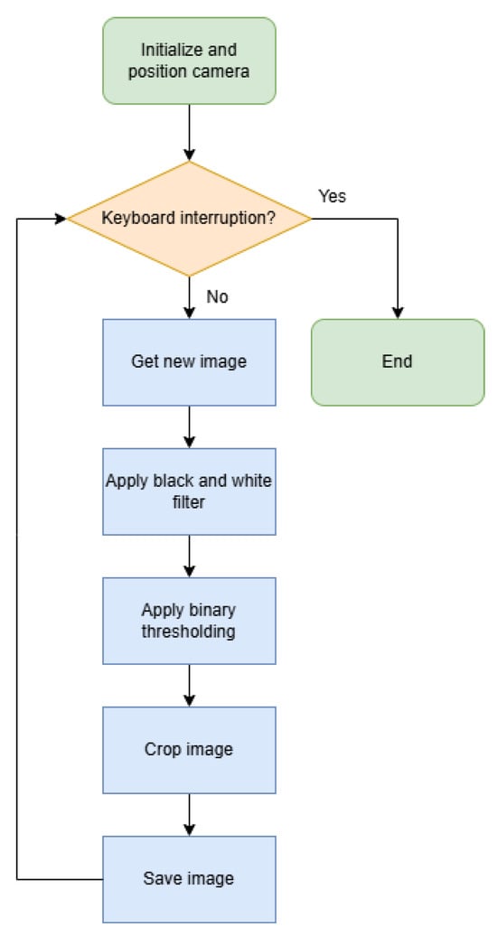 The data collected by the robot for training the neural networks were transferred to a more powerful computer equipped with an NVIDIA RTX 3060 GPU [], a Ryzen 7 3700X AMD CPU (3.6 GHZ base clock speed) [], and 32 GB of DDR4 RAM. This setup enabled faster neural network training and testing of different network configurations. The Python language (version 3.7.4) was selected because of the greater degree of familiarity already present and its powerful data visualization, which also helped the debugging process during the development of the work. The main tools included the Anaconda environment, the Jupyter Notebook, and libraries such as TensorFlow 1.14.0 and Keras 2.2.4 [,].