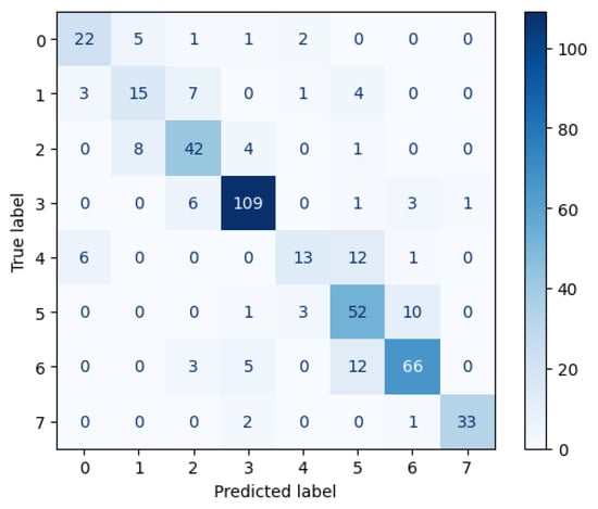 Figure 22 shows the confusion matrix of the trained model, where each label value corresponds to the class indicated in Table 6. This shows how many times the model was able to correctly categorize the test data. Thus, the main diagonal shows the number of times the model correctly predicted the class, while the off-diagonal shows the number of times the model was incorrect, classifying one class as another. The performance of the system is satisfactory as it is able, in most cases, to correctly categorize the data with an accuracy (the ratio of correctly predicted instances (both positive and negative) to the total number of predictions) of 79.17%, precision (the ratio of correctly predicted positive observations to the total number of predicted positive observations) of 74.92%, recall (the ratio of correctly predicted positive observations to all actual positive observations) of 0.7375, and F1-score (the harmonic mean of accuracy and recall, providing a balance between the two) of 0.7360.
