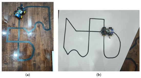 The performance of the previous model was influenced by environmental and operational factors, which required adjustments to optimize behavior. One of the first changes was to replace the original track, placed on a shiny wooden floor that generated noise in the images, with a high-contrast black and white track (Figure 23b), which increased accuracy.